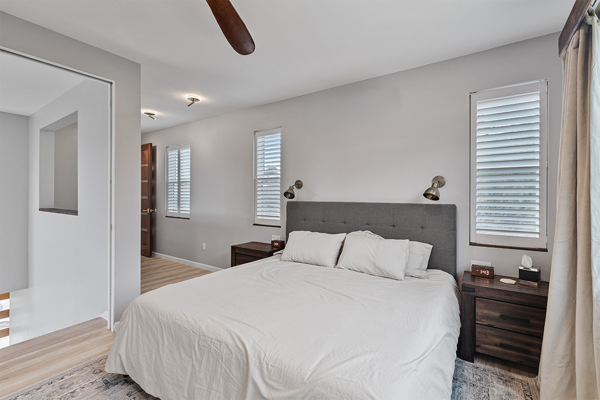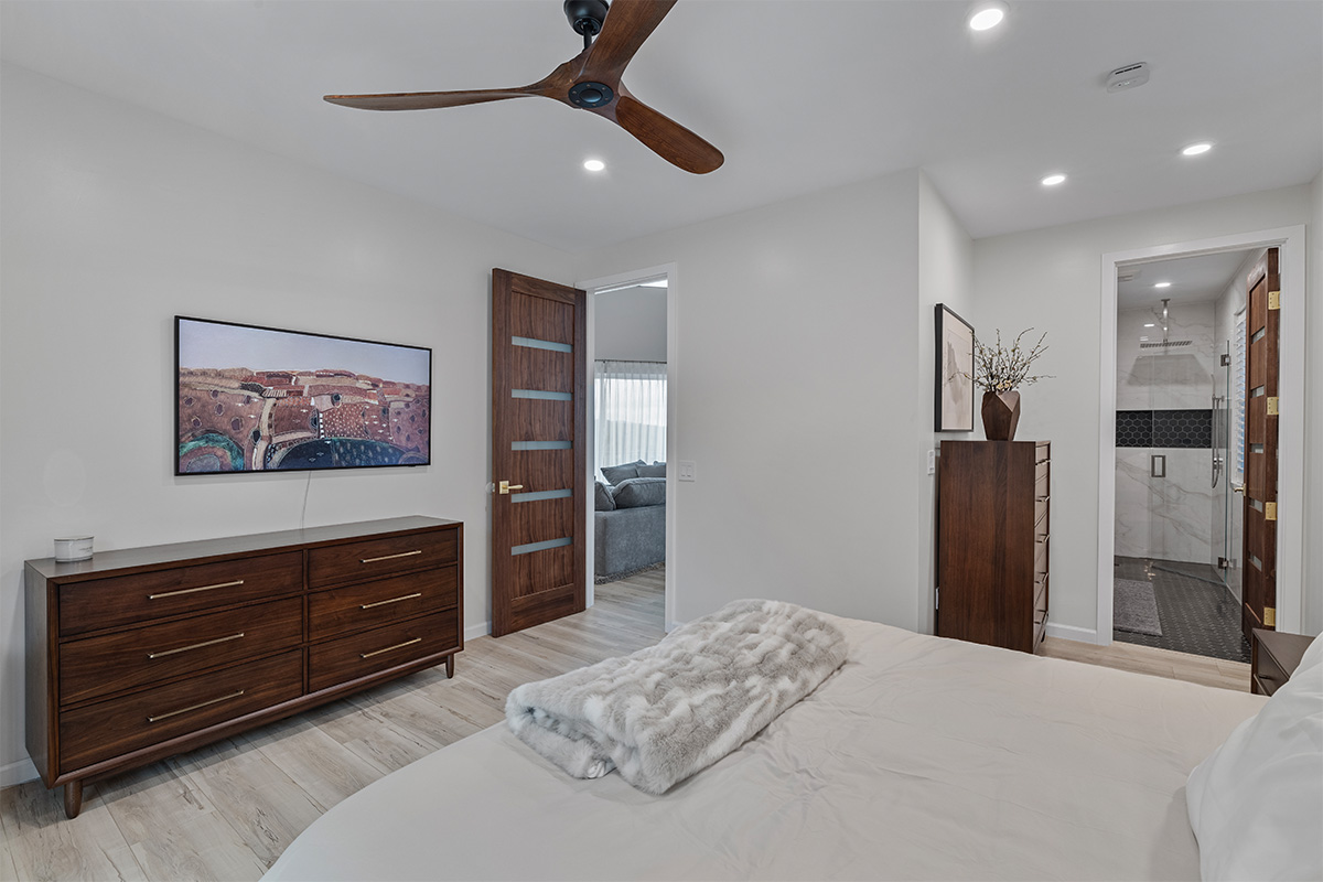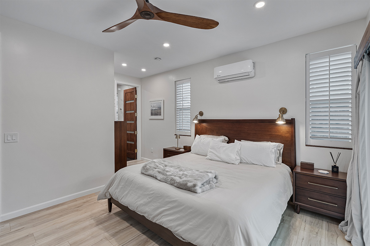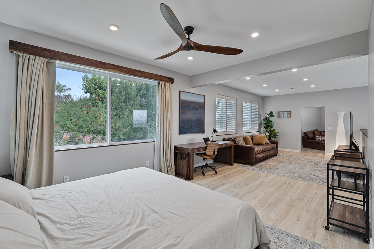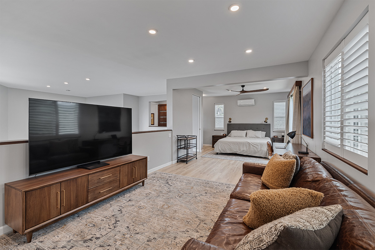 The master suite is a true oasis, with a spa-like bathroom and a separate living room with couch that also doubles as a queen size bed.