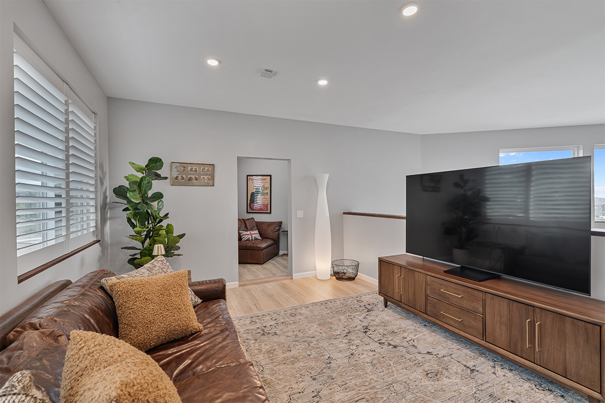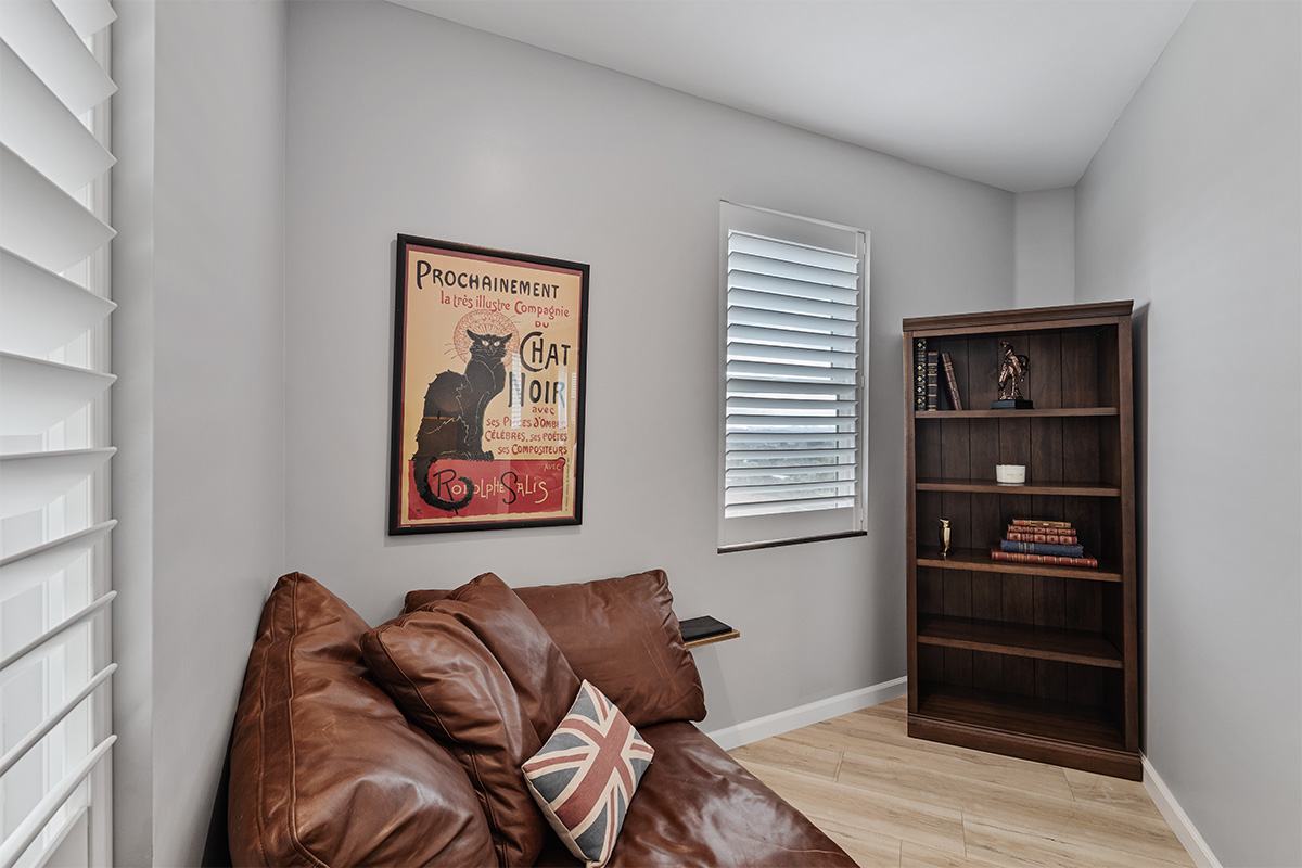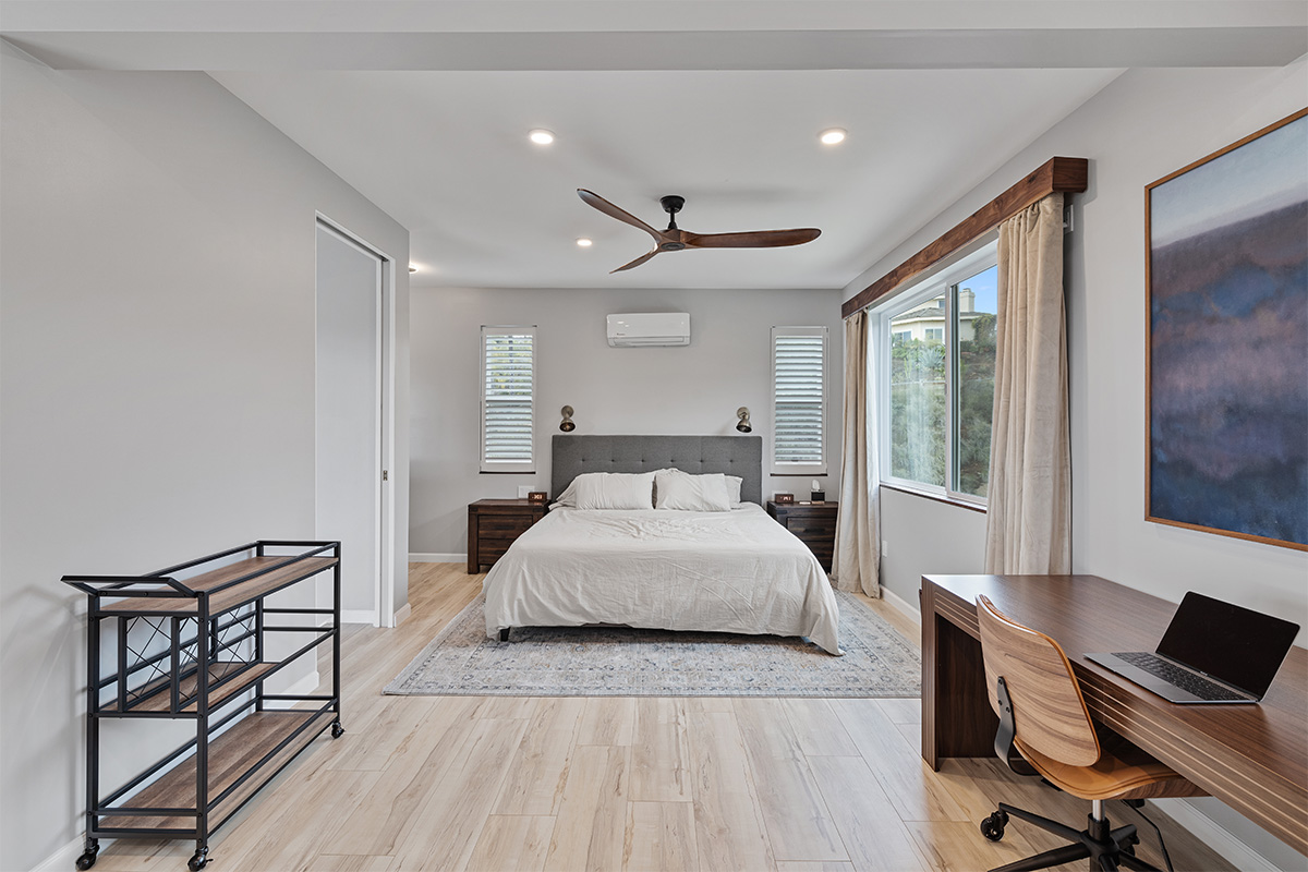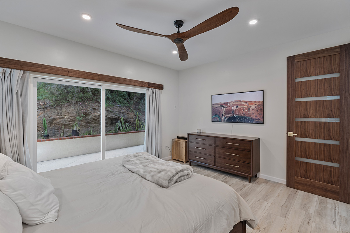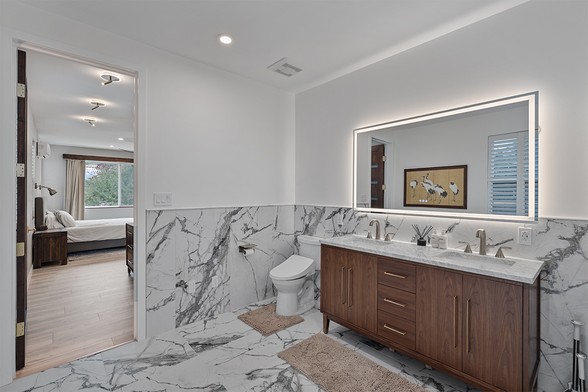 The master suite is a true oasis, with a spa-like bathroom and a separate living room with couch that also doubles as a queen size bed.