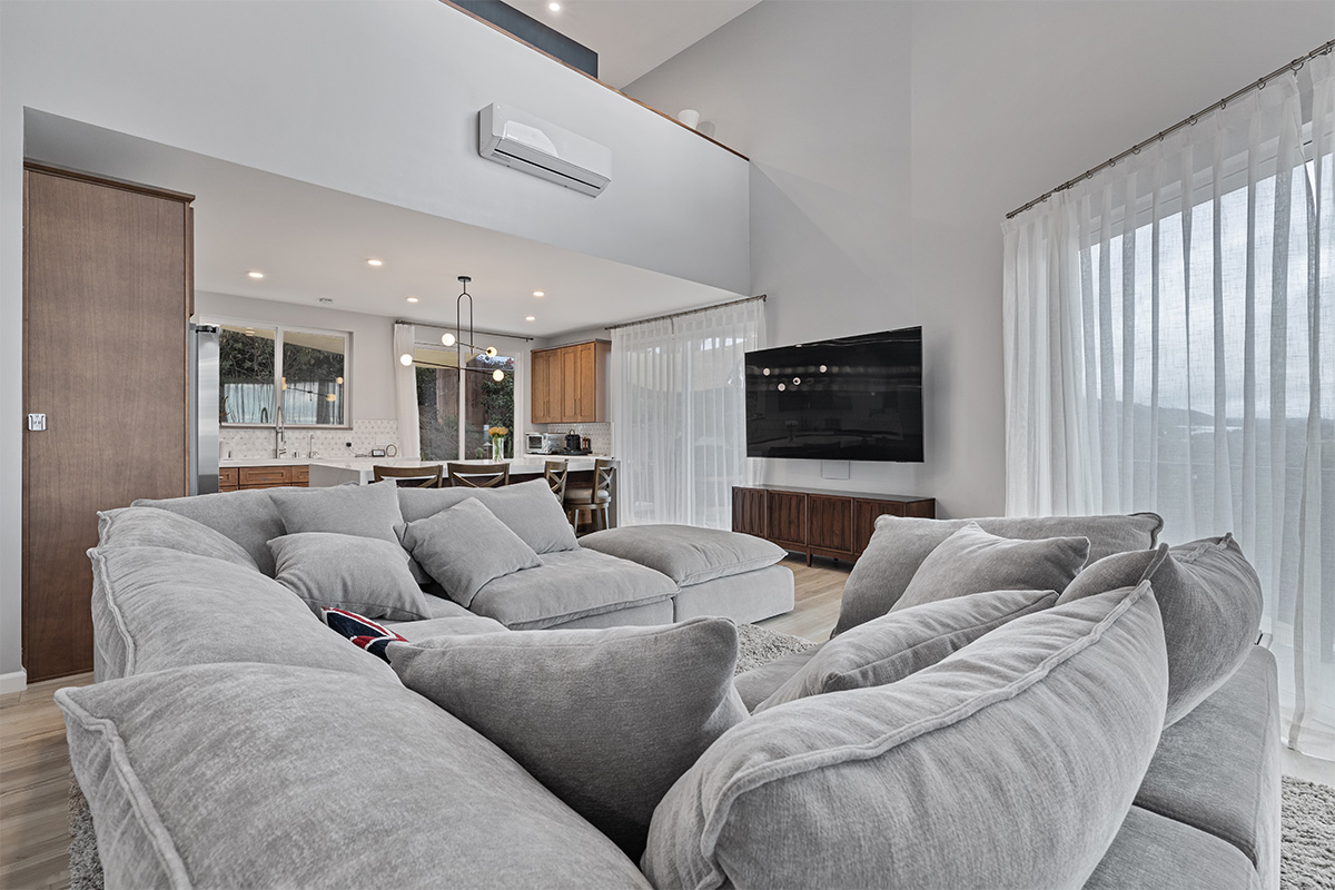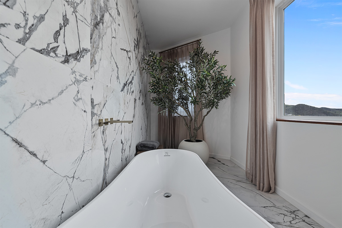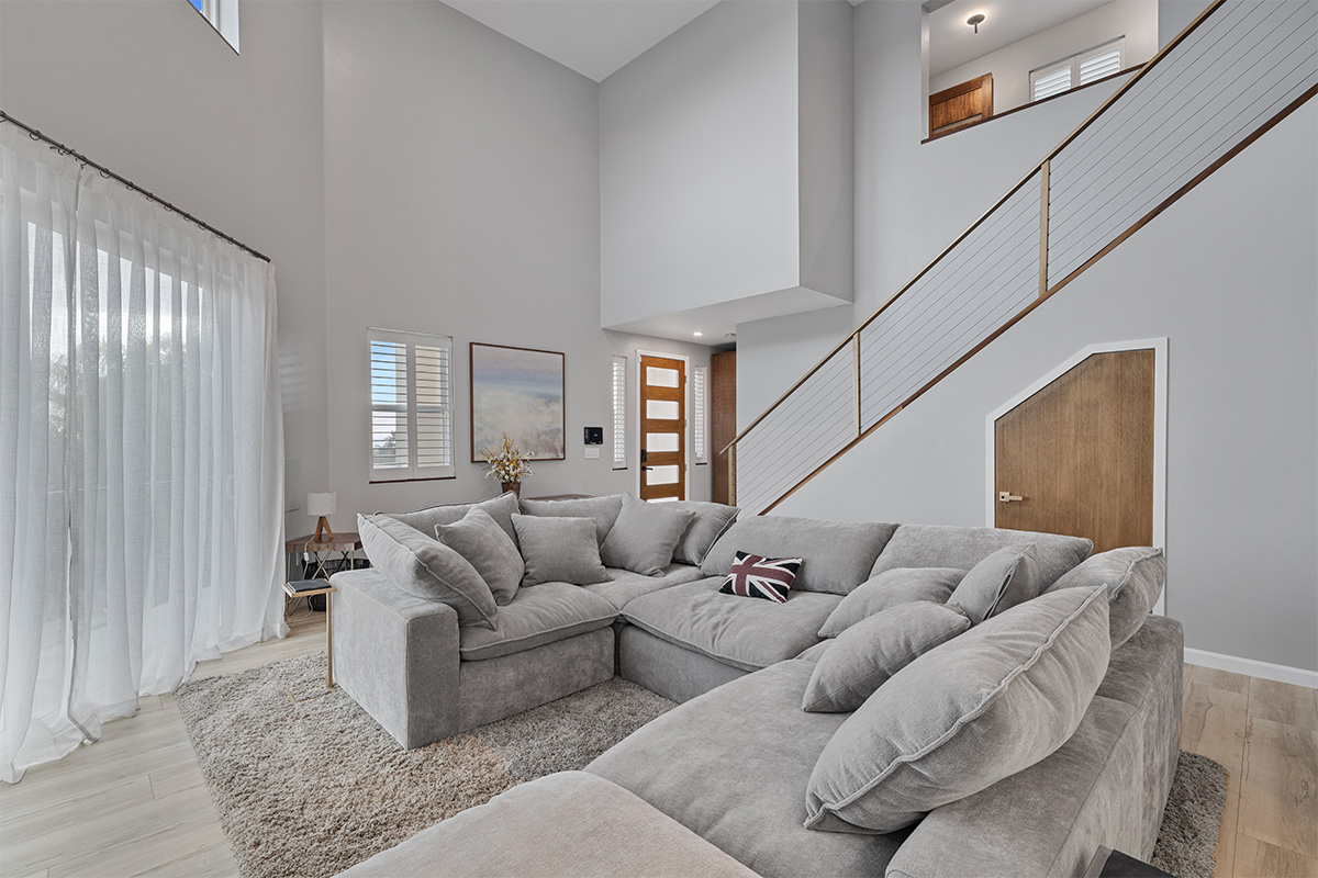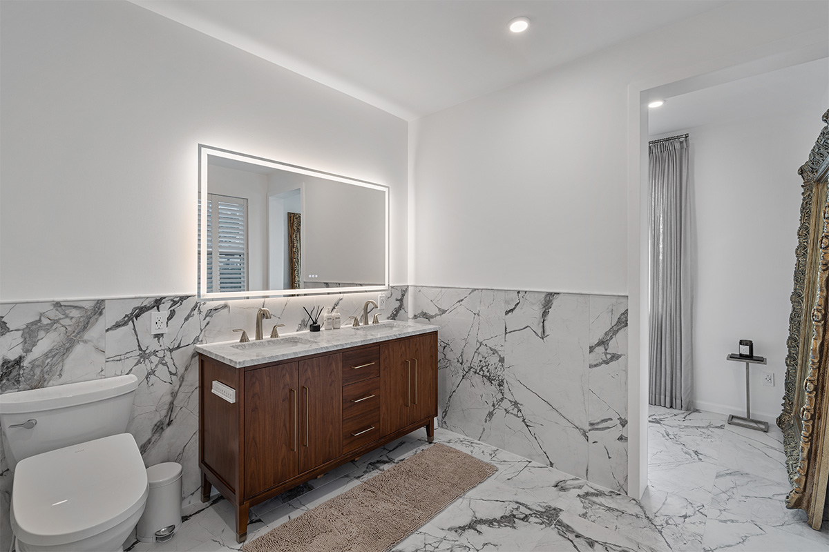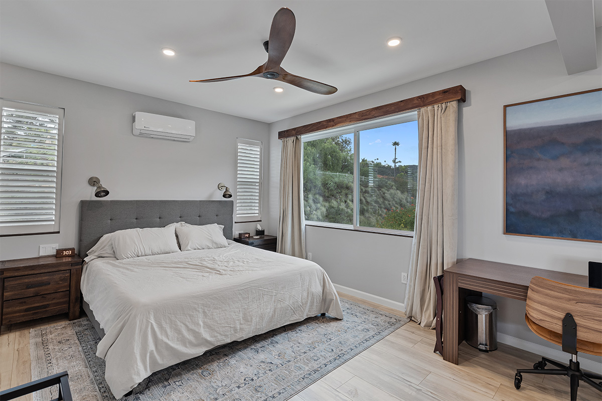 The master suite is a true oasis, with a spa-like bathroom and a separate living room with couch that also doubles as a queen size bed.